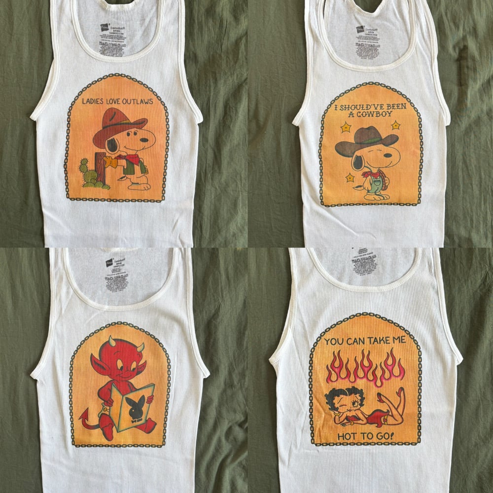 DTG printed tanks. Hand cut, raw hem bottoms!